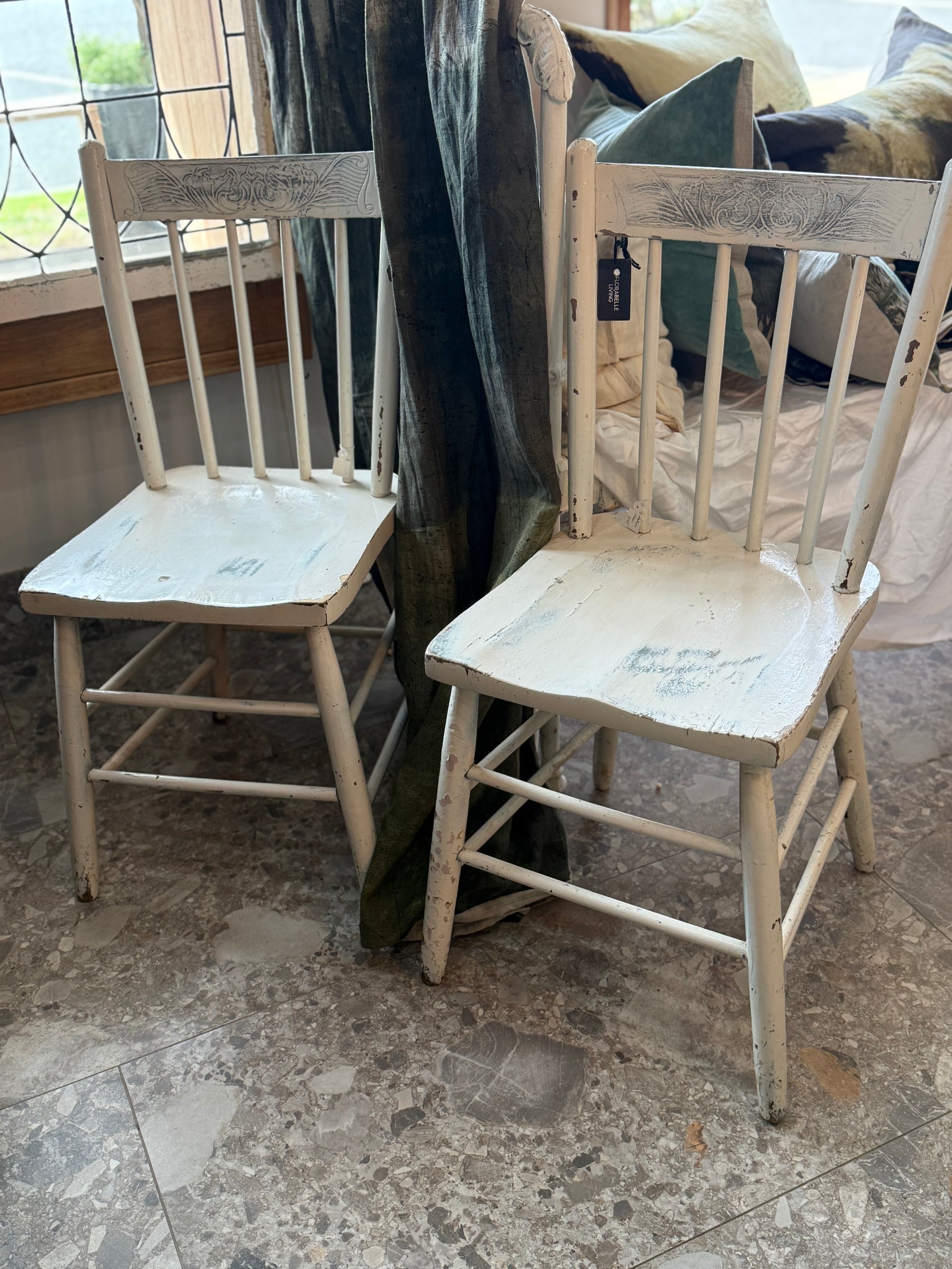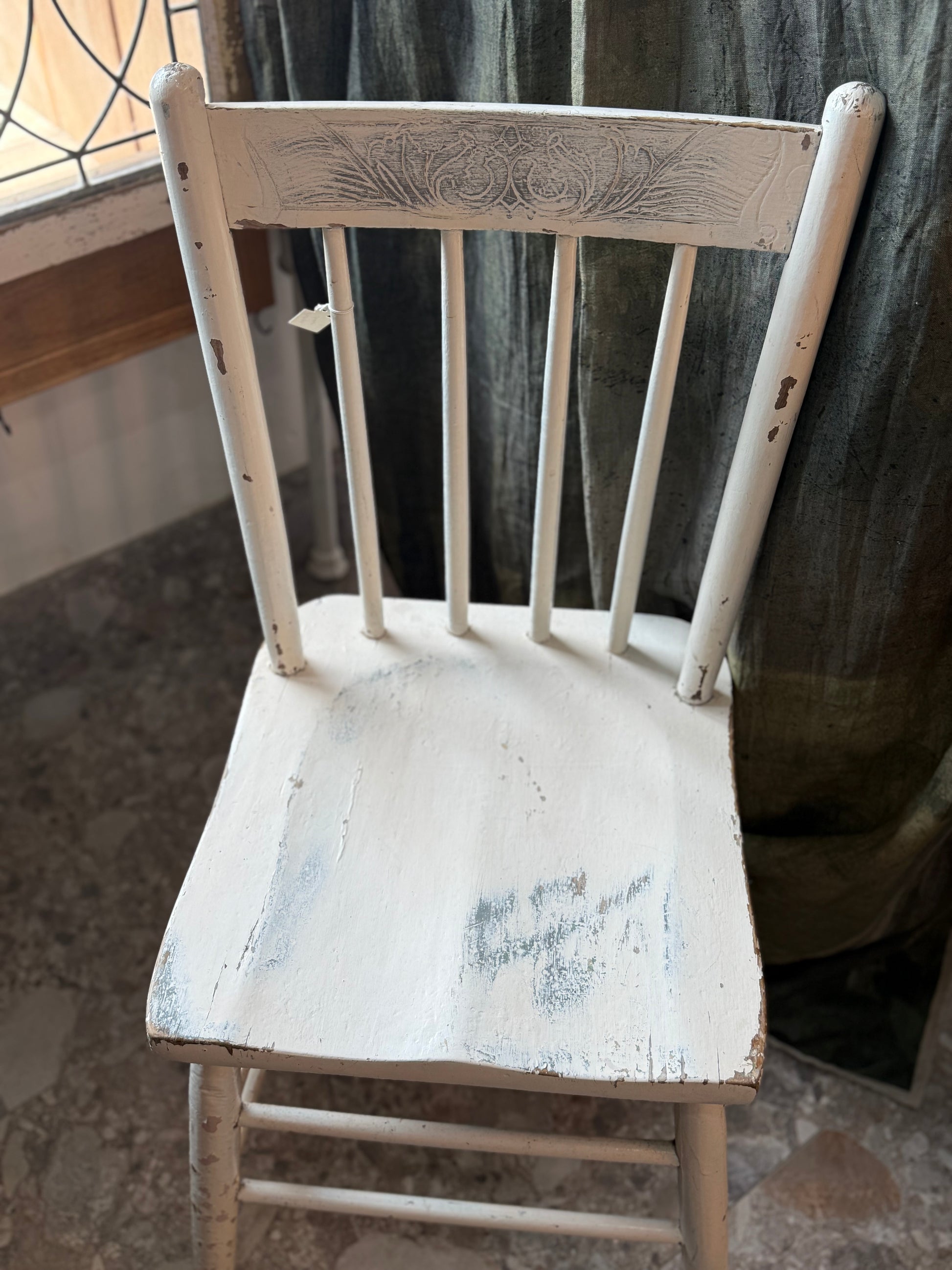 Amazing chippy paint and beautiful patina, this sturdy old timber chair would be a beautiful kitchen chair at the table (there is a matching chair to create a pair) or sit in the bedroom corner for a lovely touch of unique vintage.