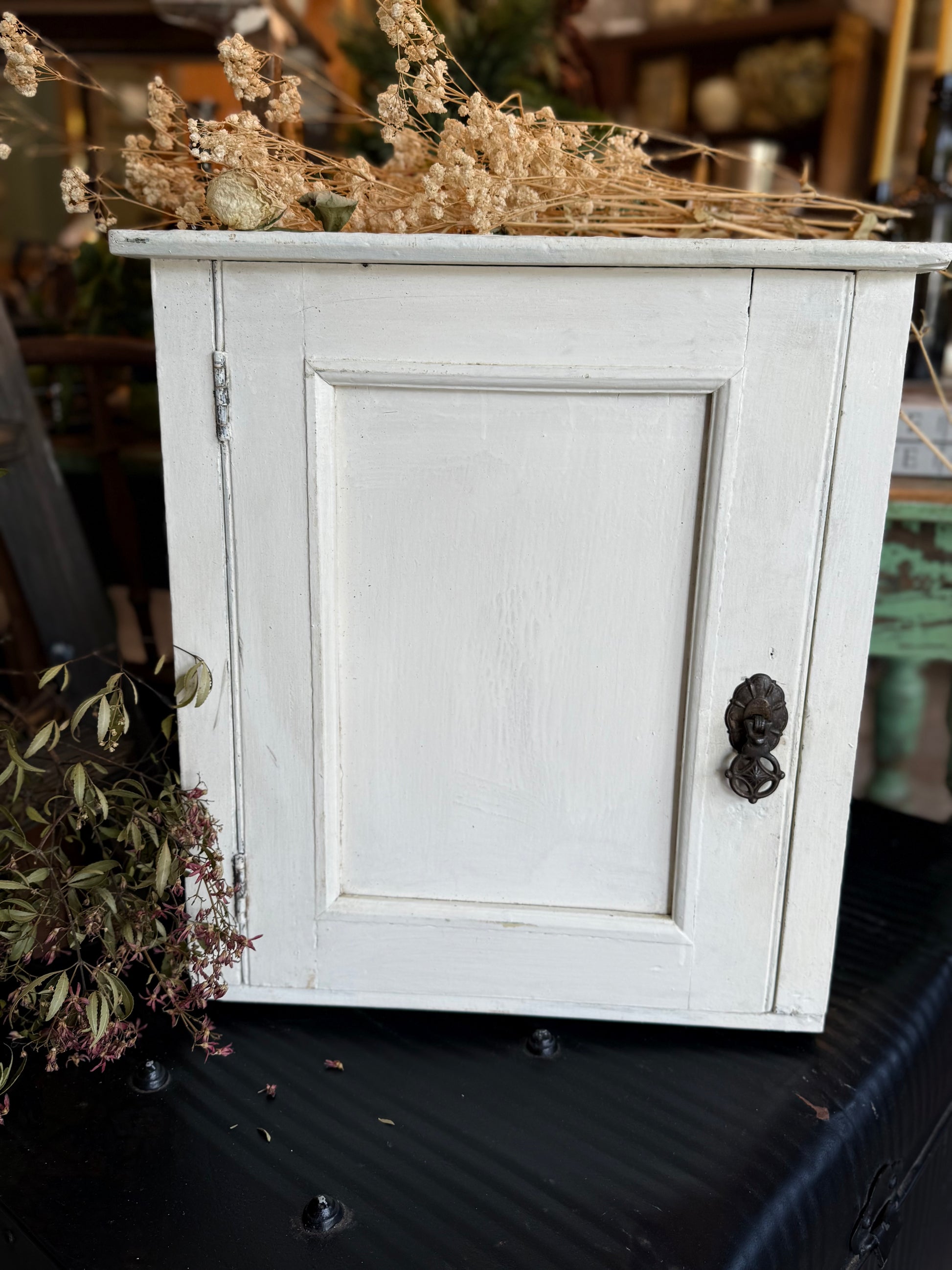 A beautiful old cabinet with sweet detailed handle, ready to hold your treasures or use as a storage cabinet in bathroom, laundry or bedroom. Looks gorgeous sitting on a shelf or could be fixed to a wall.
