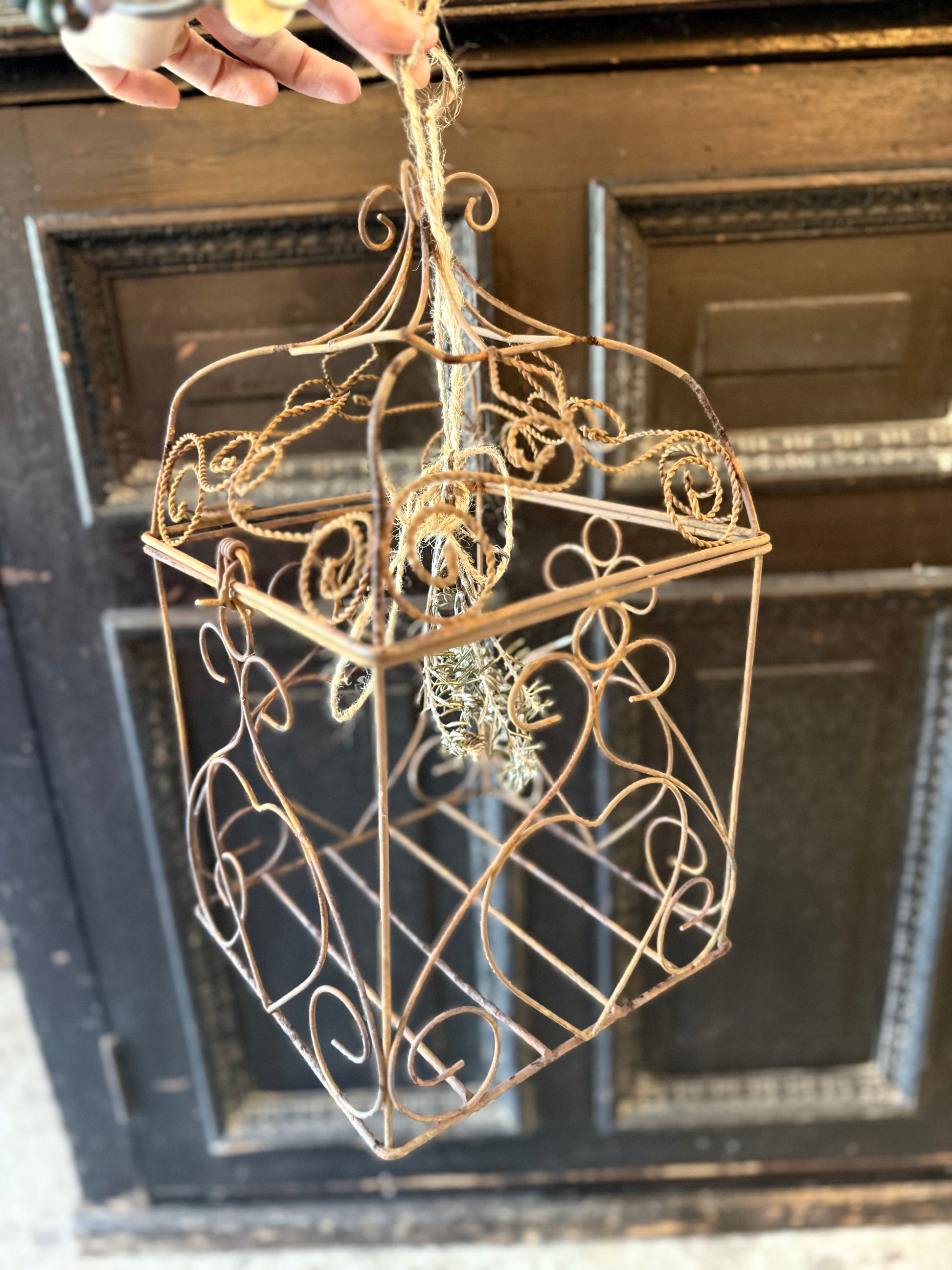 This beautiful metal vintage bird cage looks great hanging with greenery or florals - anything you'd like to display! A great vintage piece.