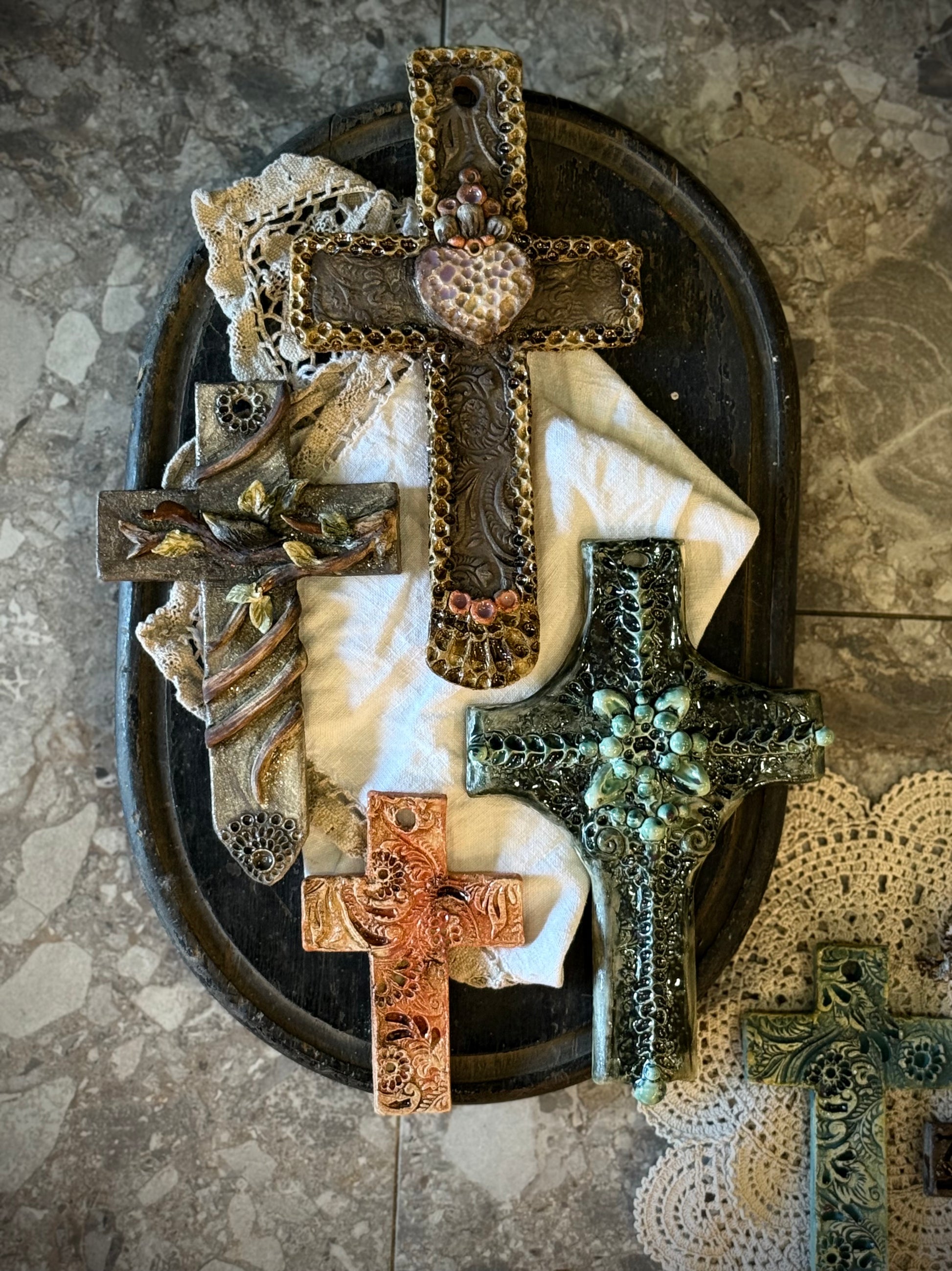 A gorgeous ceramic cross wall hanging with textured pattern detailing that brings beautiful whimsy to your home. These unique decor pieces look great hung alone or grouped together. Hand made by local artist Linda Titow.