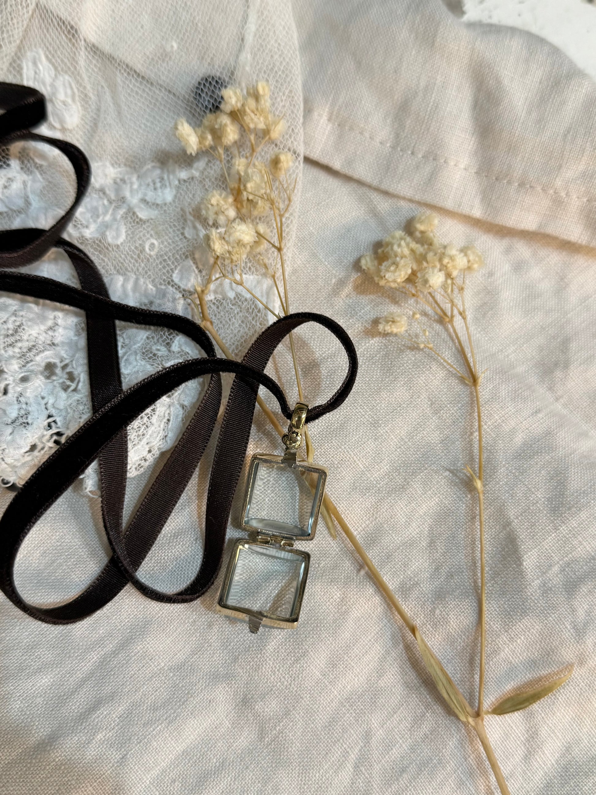 This gorgeous range of jewellery showcases beautifully nostalgic rock crystal lockets - available in Square, Oval and Round in various sizes - all on a velvet ribbon. Can be worn as is or with a treasure inside.