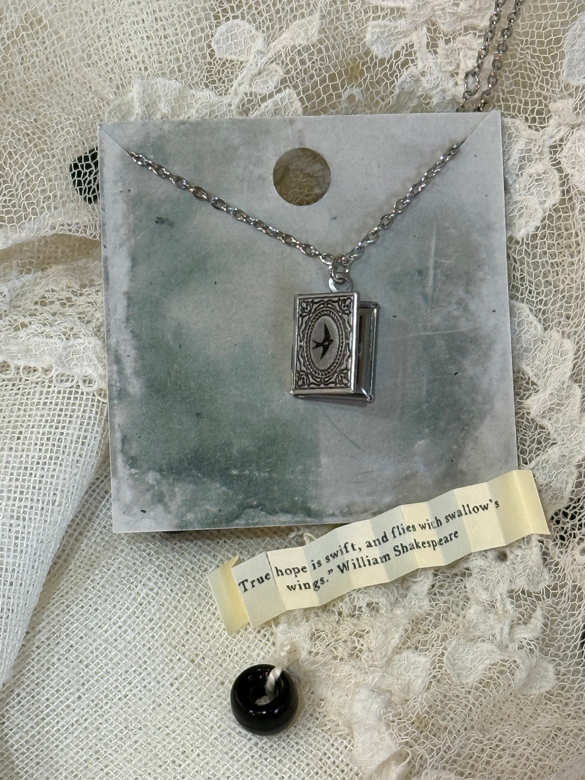 This exquisitely detailed Swallow locket is a miniature book made from silver plated brass, and inside this book necklace is a special message folded and fitted inside the locket to look just like the pages of a real book!