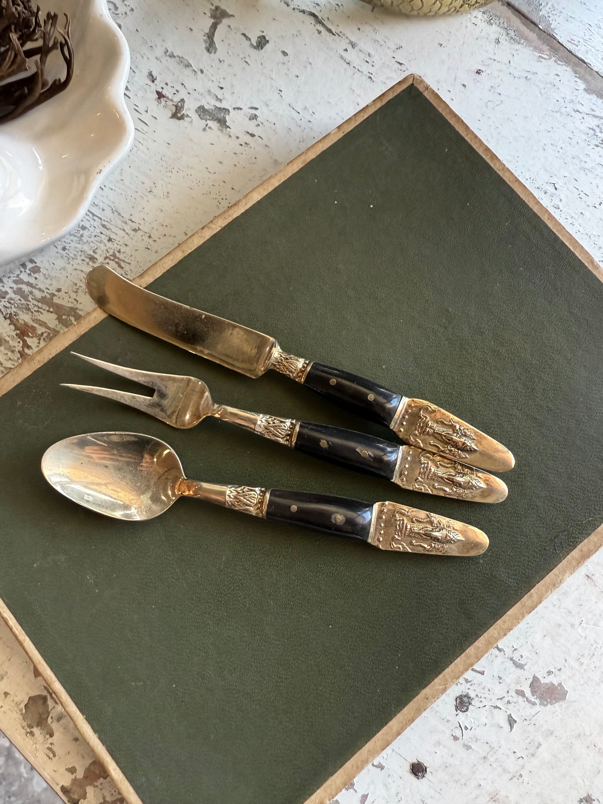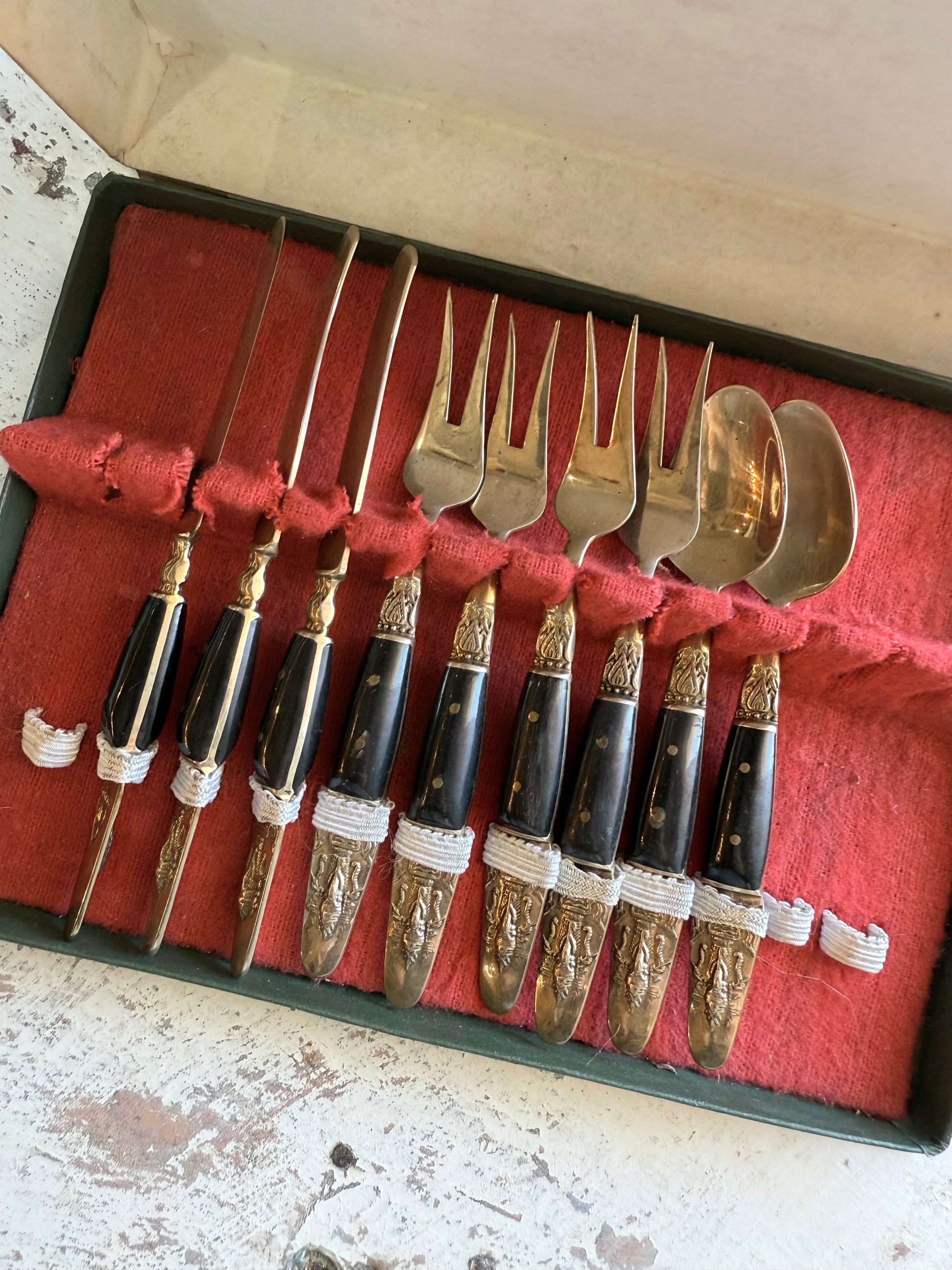 A sweet little collection of mini bronze cutlery, made in Thailand, in their original vintage green box. Use for the cake table or cocktail hour!