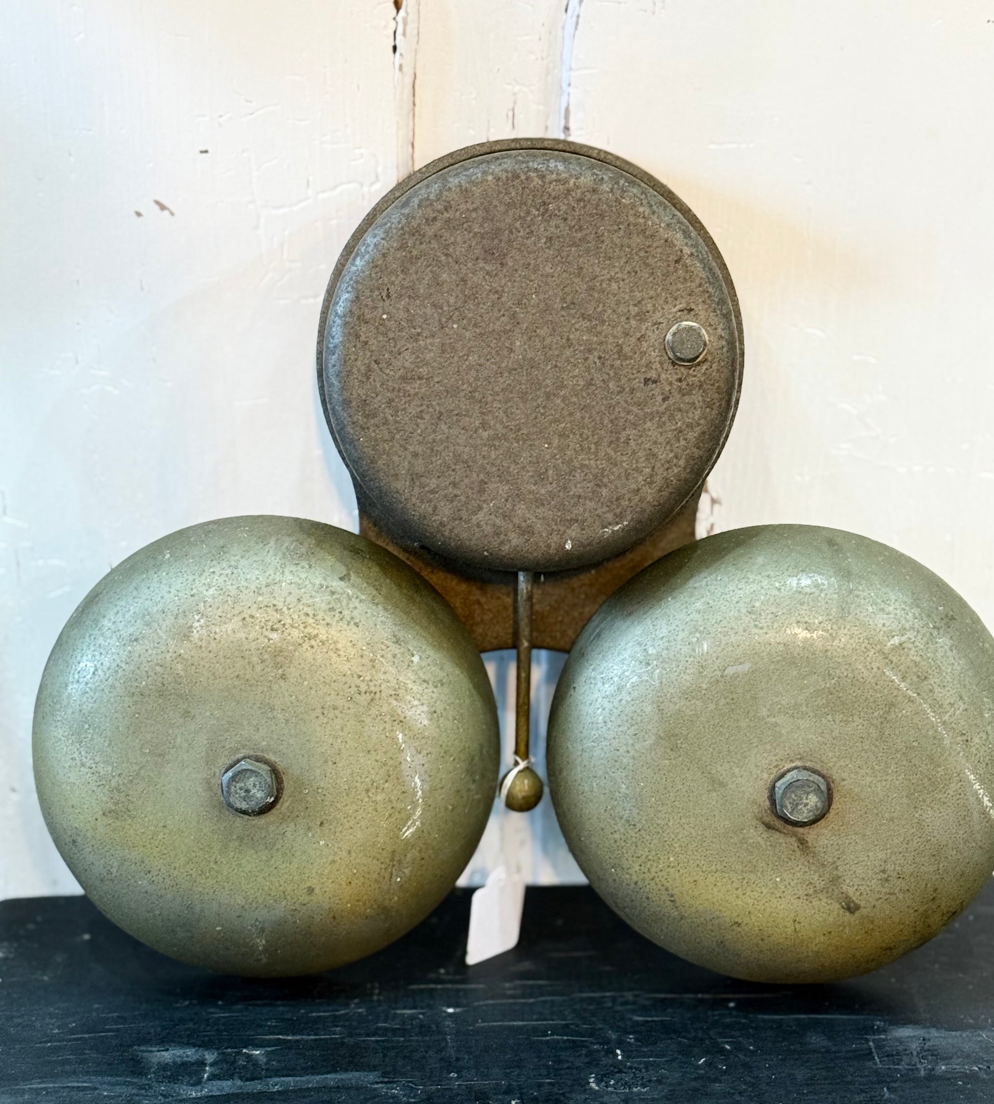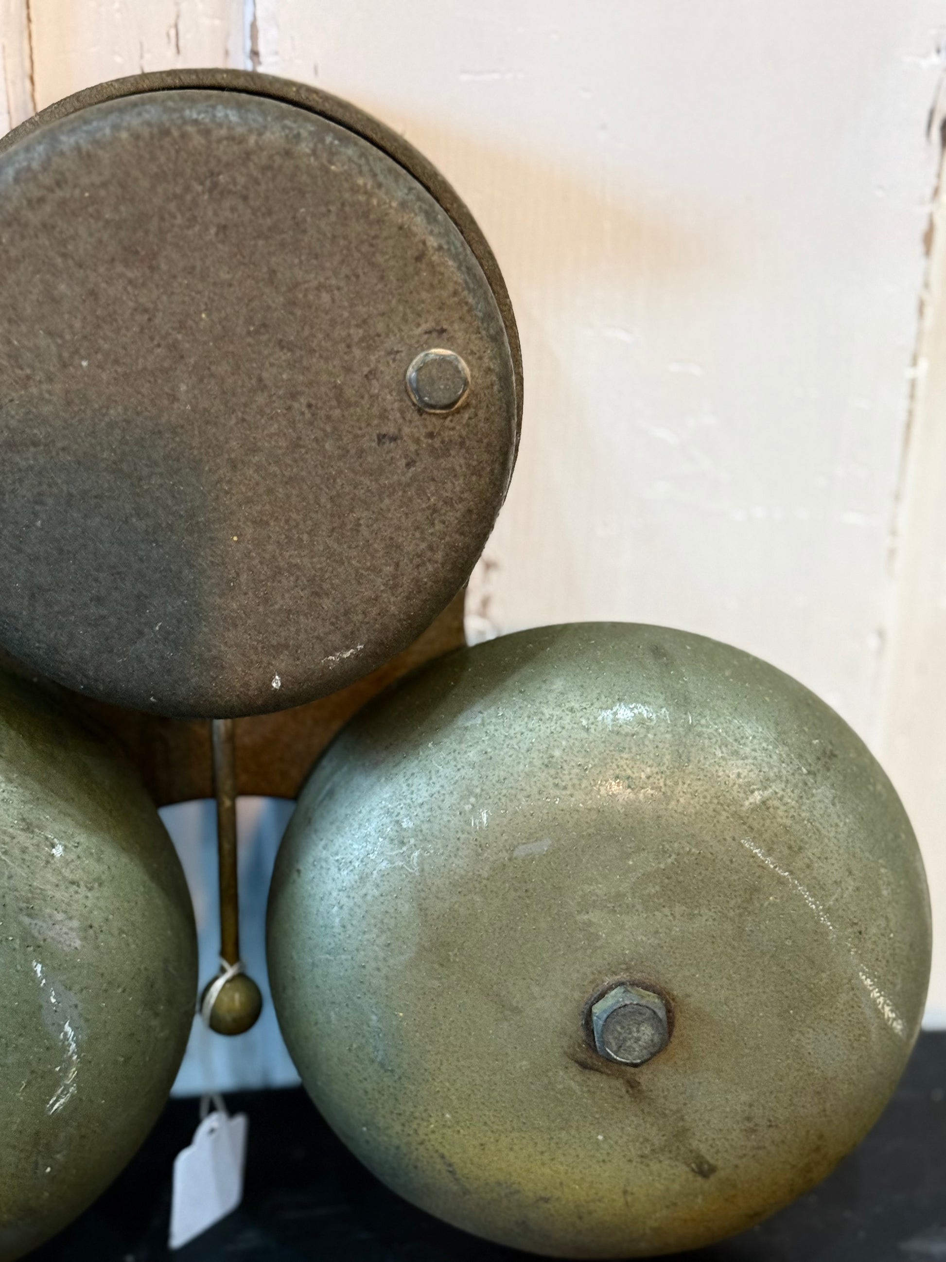 This amazing old brass bell trio has so much character! It would make a great feature at the front door, or hung as a piece on your treasure-filled mural wall.