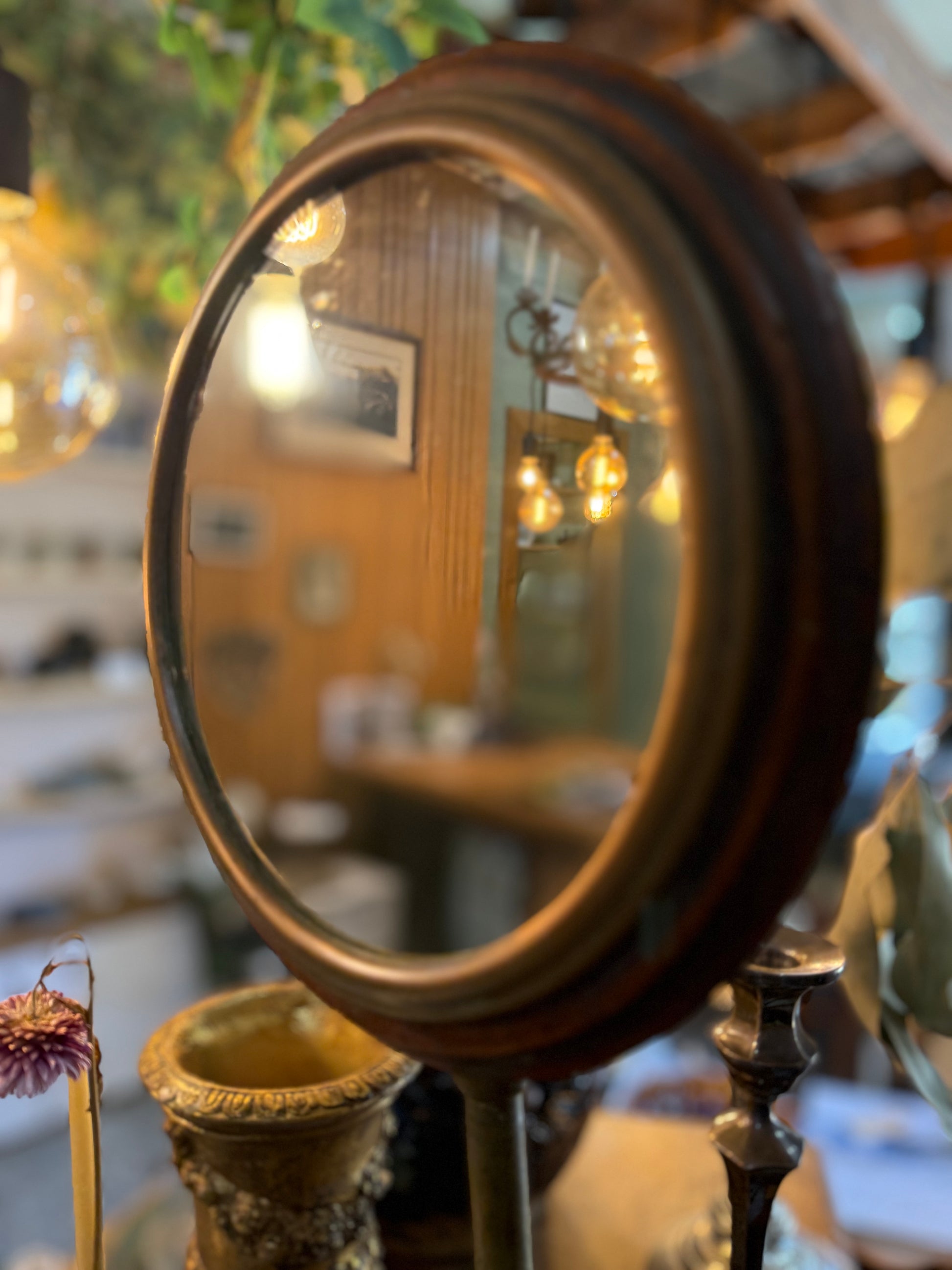 This stunning old mirror would look gorgeous styling a unique bathroom or bedroom. Useable as a hand-held mirror or a table mirror, with adjustable height and tilt.