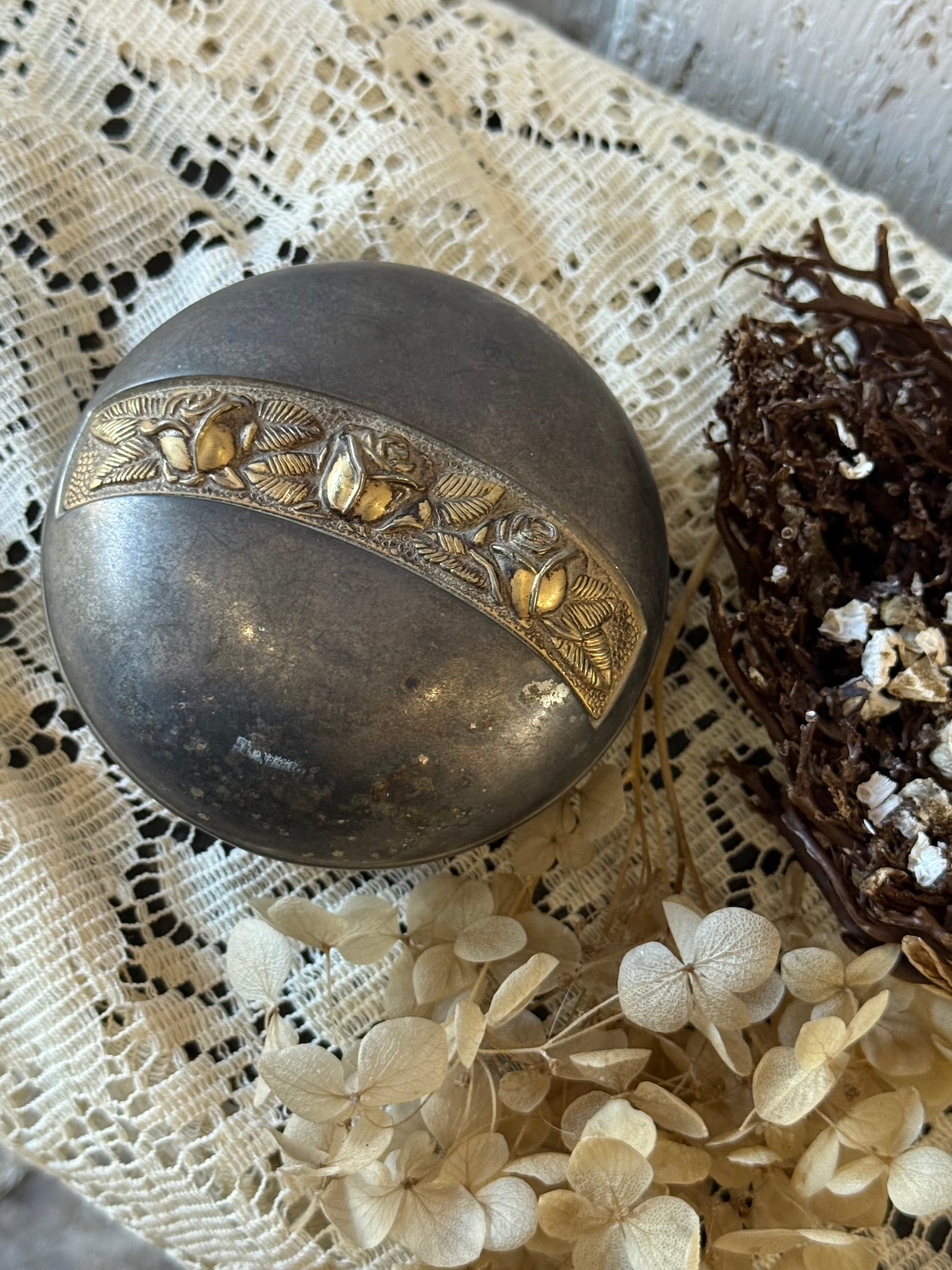 This stunning little silver-plated jewellery case with navy velvet lining and brass rose detailing is such a sweet piece to add to the dresser!