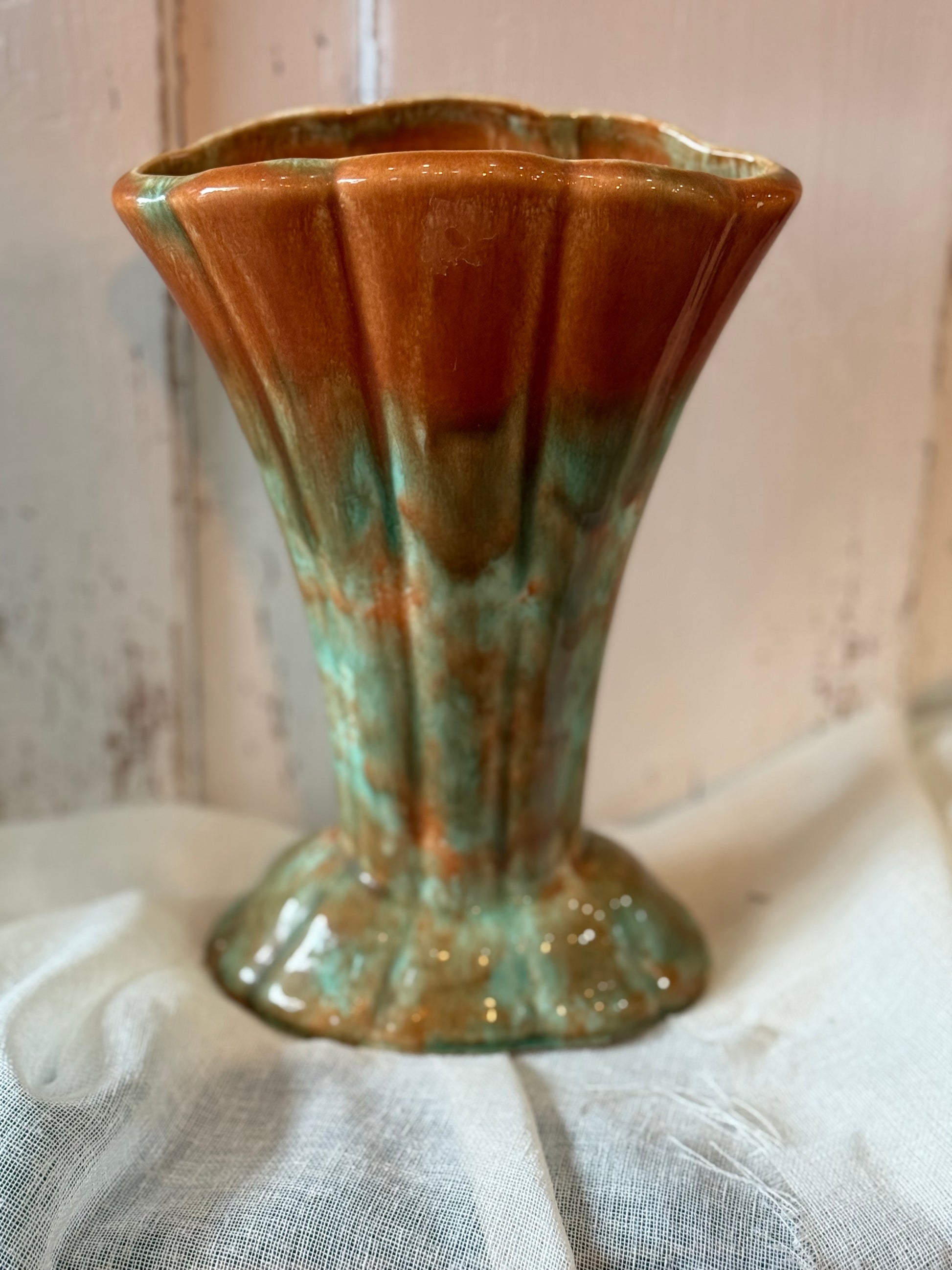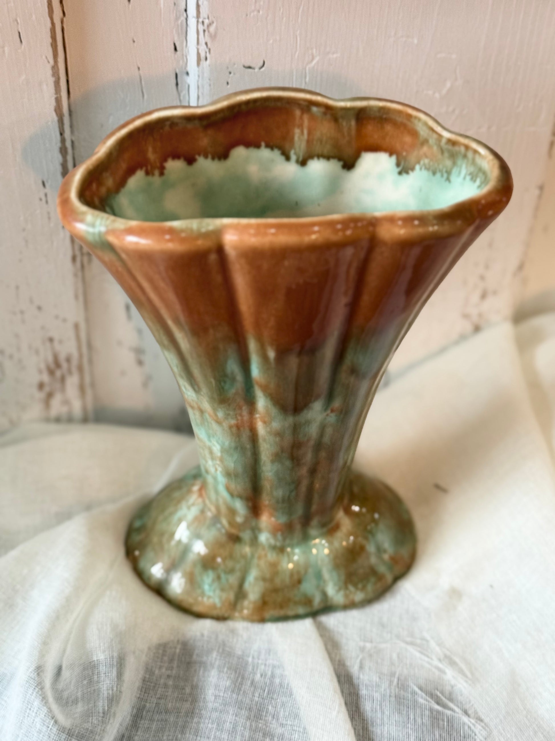 This is a beautiful fan-shaped vintage Australian Diana Pottery vase in lovely green and brown hues. A perfect addition to the pottery collection or a gorgeous vintage styling piece for the bookshelf or bedside.