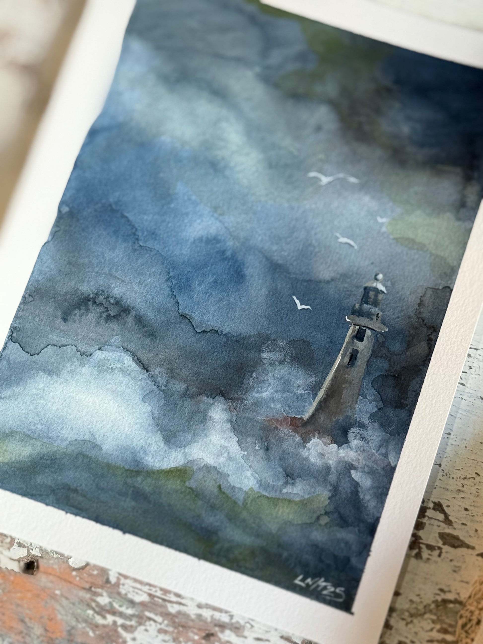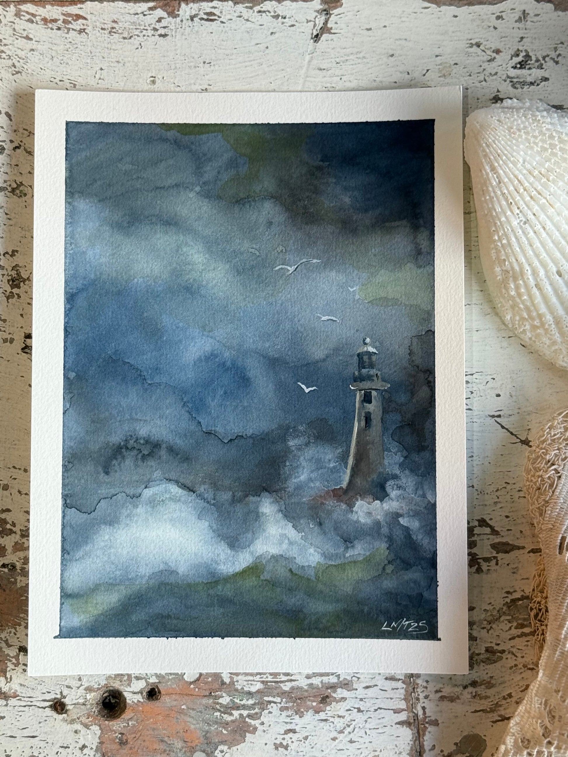 Water Colour; Stormy Lighthouse - unframed - Linda Titow